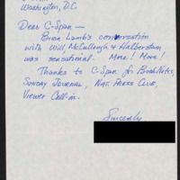 Describes Brian Lamb's conversation with David Halberstam, David McCullough, and George Will as sensational. Further mentions praise for Booknotes, Sunday Journal, National Press Club, and call-ins.