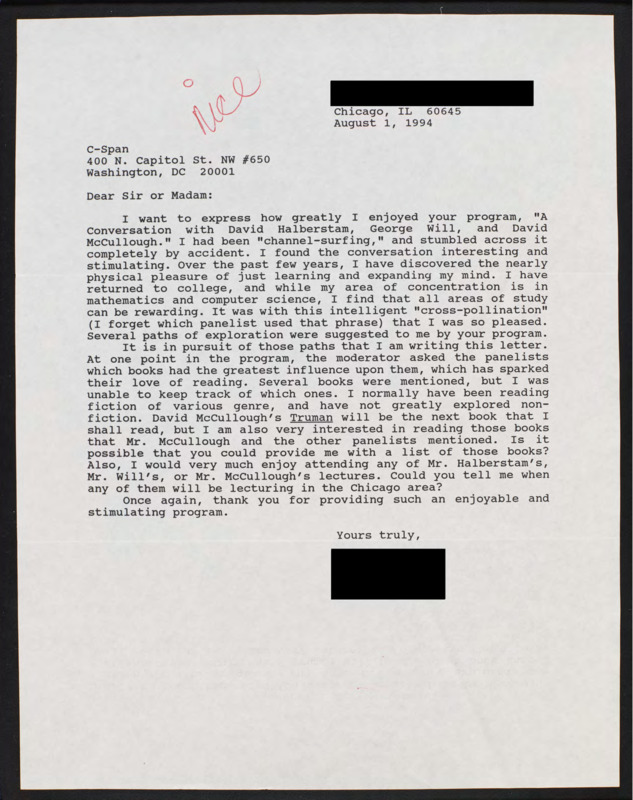 Letter to C-SPAN, 1994-08-01; 60645