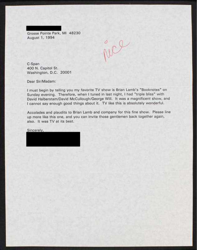 Says Booknotes is their favorite program and it was "triple bliss" to watch David Halberstam, David McCullough, and George Will.