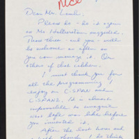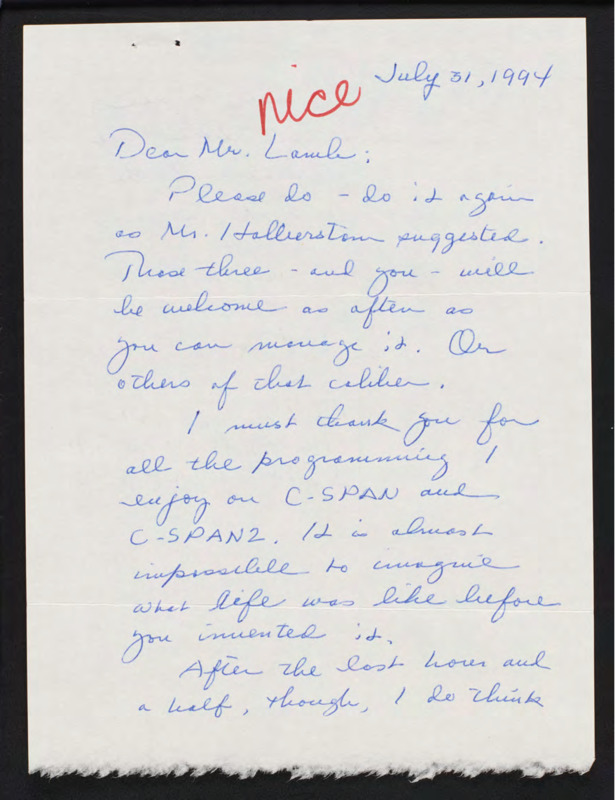 Requests more programming with David Halberstam, George Will, and David McCullough. Says it's hard to image what life was like previous to the creation of C-SPAN & C-SPAN2.