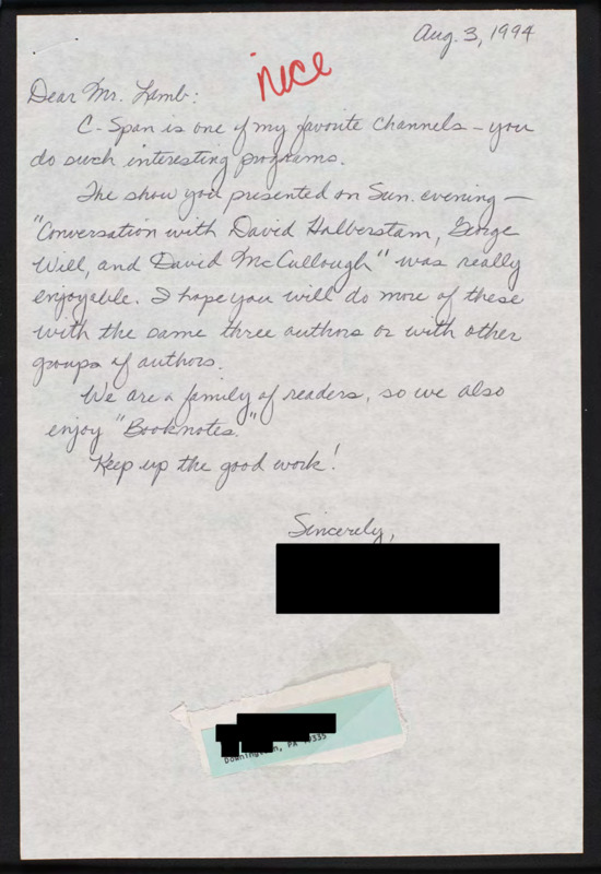 Describes the program with David Halberstam, George Will, and David McCullough as enjoyable. Briefly mentions enjoying Booknotes as well.