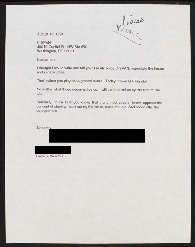 Says they enjoy watching the network when Congress is voting and supports playing music during voting periods.