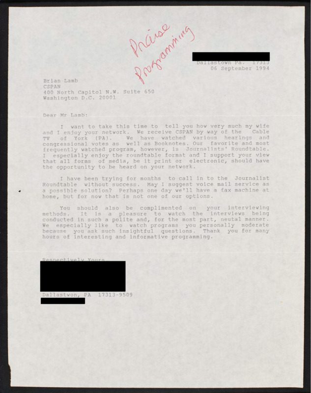 Praises the network's programs, specifically Booknotes. Suggests using a voice-mail service for the Journalists' Roundtable, and praises Brian Lamb's interview methods.