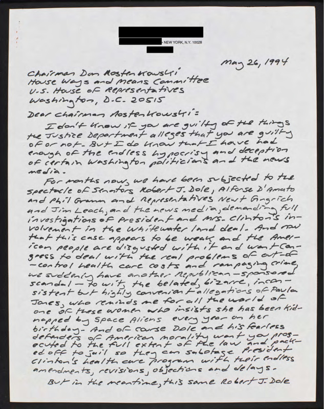Writes to the Chairman of the House Ways and Means Committee claiming Robert J. Dole is trying to sabotage Bill Clinton's health care plan by investigating him. Claims the media is attempting to cover up the murders of Lido Anthony Iacocca.