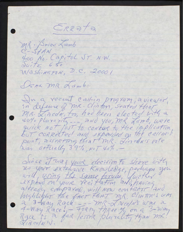 Explains Brian Lamb's statement that Abraham Lincoln won the election with a plurality of 39%. Says Bill Clinton's 40% plurality was in a 3-way race while Lincoln's was a 4-way race.