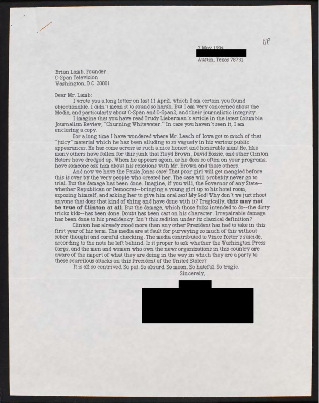 Defends Clinton against the sexual harassment accusations and blames the media for the attacks. Attached are articles about the Whitewater affair.
