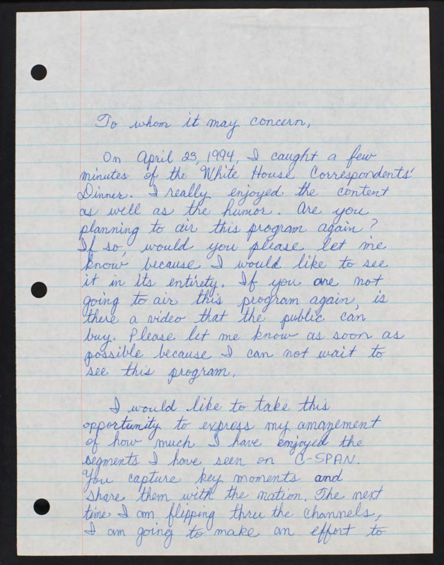 Asks for a program schedule if the network intends to rebroadcast the White House Correspondent's dinner or if it available to be purchased. Explains why they feel the network's programs are amazing.