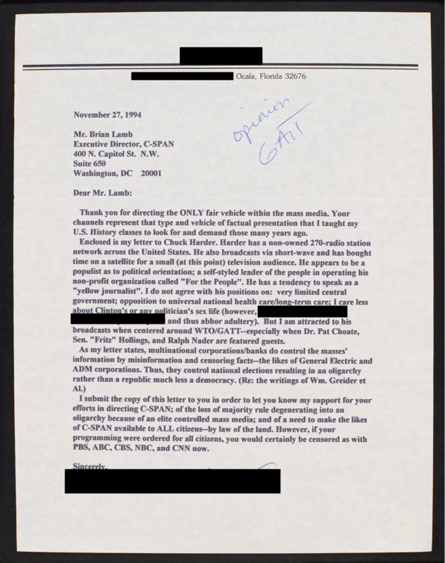 Letter to C-SPAN, 1994-11-27; 32676
