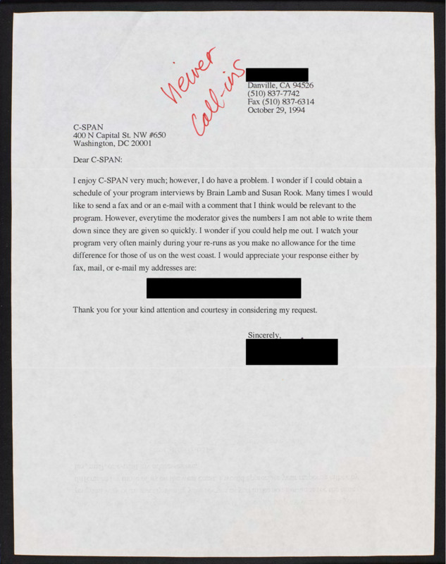 Letter to C-SPAN, 1994-10-29; 94526