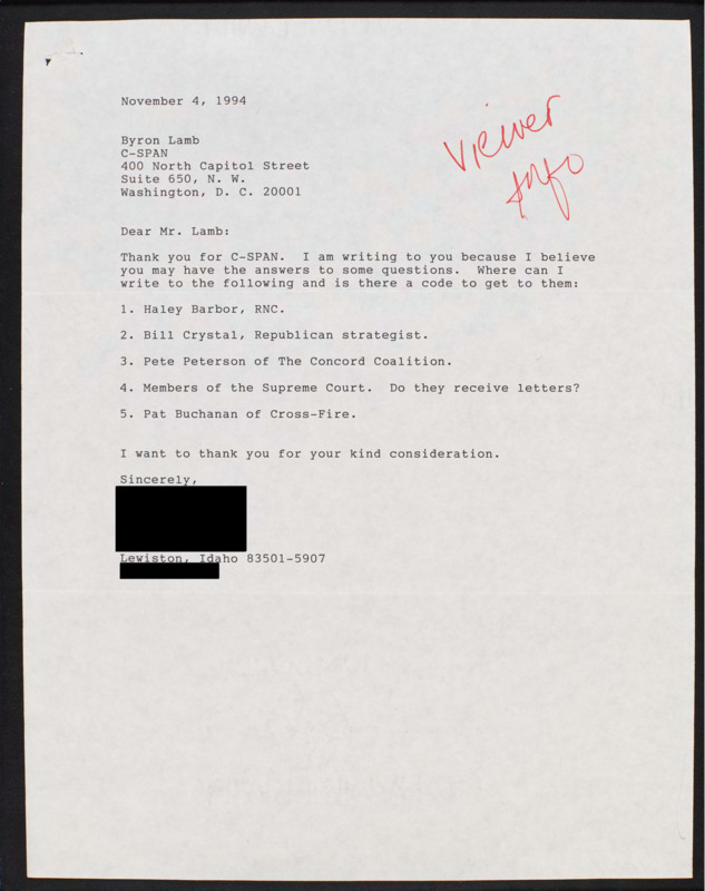 Letter to C-SPAN, 1994-11-04; 83501