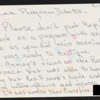 Asks the network to not invite Representative Barney Frank on future programs. Says Frank rudely interrupted discussions on the Republican contract.