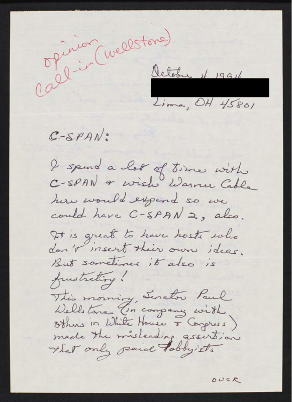 Praises the network's hosts and would like their cable company to expand services to provide C-SPAN2. Criticizes Senator Paul Wellstone for giving misinformation about a lobbying bill.