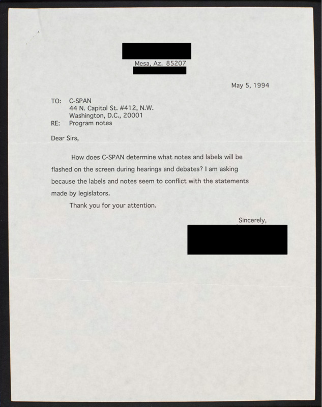 Letter to C-SPAN, 1994-05-05; 85207