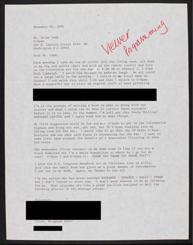 Letter to C-SPAN, 1994-11-10; 48507