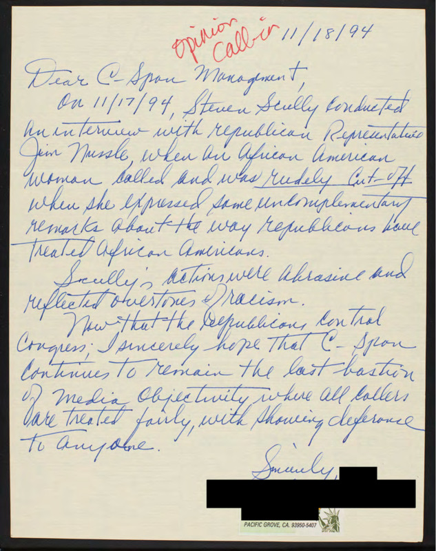 Letter to C-SPAN, 1994-11-18; 93950