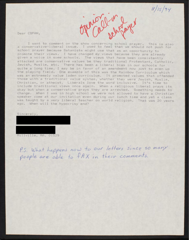 Letter to C-SPAN, 1994-11-15; 01529