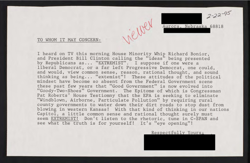 Letter to C-SPAN, 1995-02-22; 68818