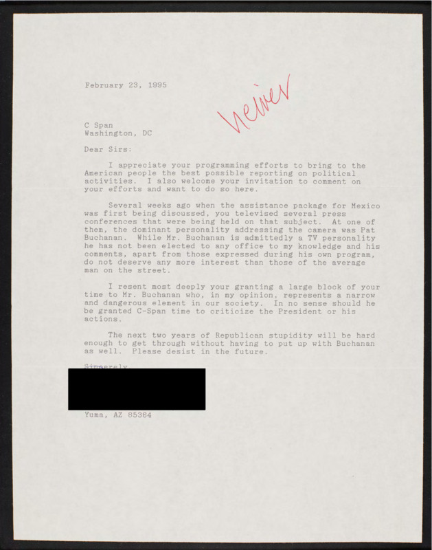 Resents the network for granting Pat Buchanan a large amount of time to speak when the assistance package for Mexico was in discussion.