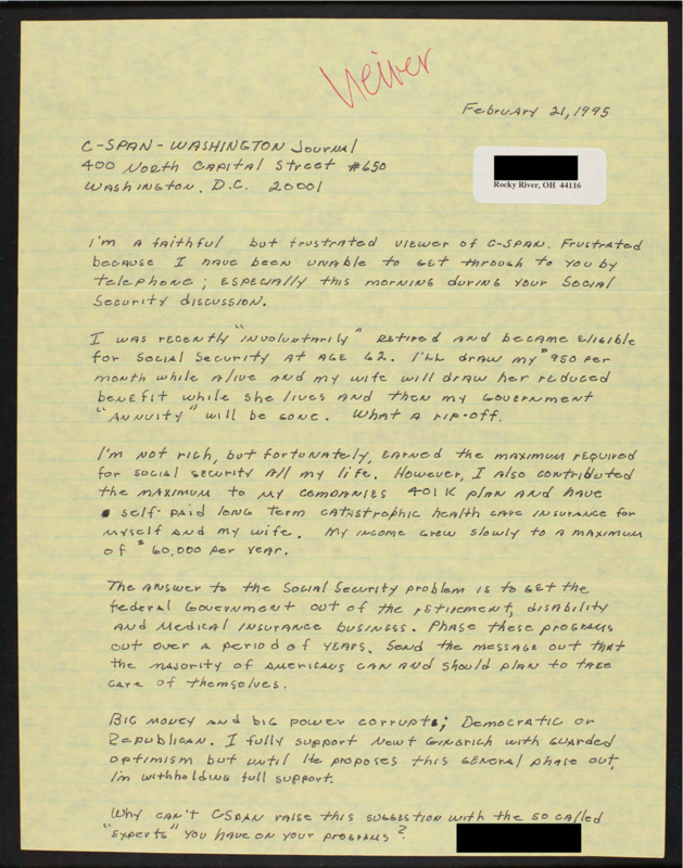 Letter to C-SPAN, 1995-02-21; 44116