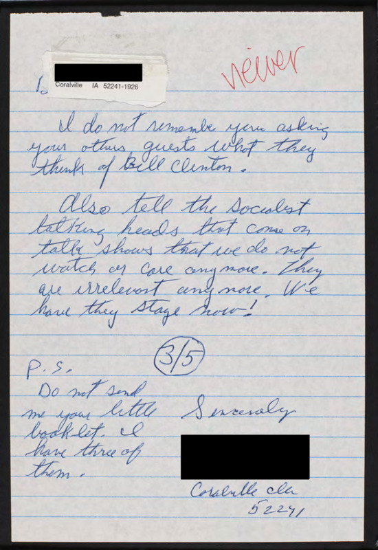 Says they can't remember guests being asked their opinions on Bill Clinton. States they do not care about the "socialist talking heads" that appear on talk shows.
