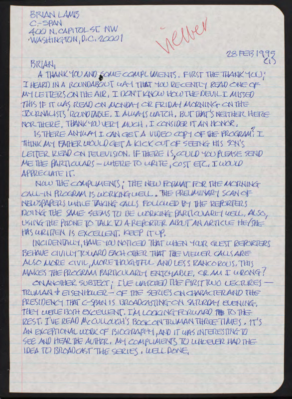 Letter to C-SPAN, 1995-02-28; 16001
