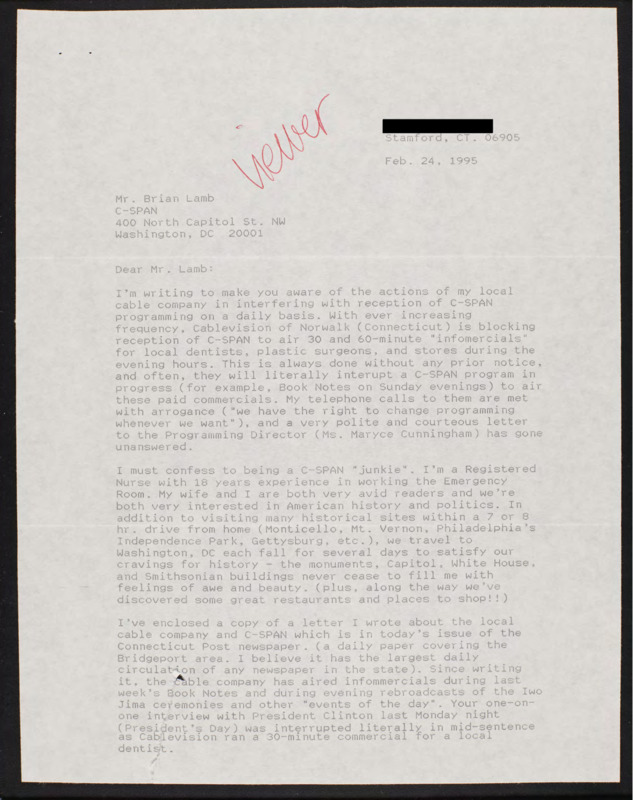 Complains about their cable provider interrupting C-SPAN programming for infomercials. Attached is an article about infomercials interrupting C-SPAN.