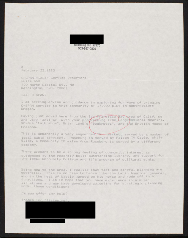 Letter to C-SPAN, 1995-02-22; 97470