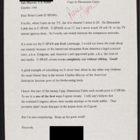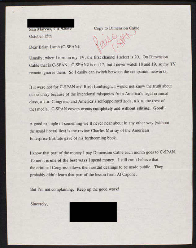 Praises the network and Rush Limbaugh for covering events unedited. Expresses support for Charles Murray and attached is a letter addressed to Murray.
