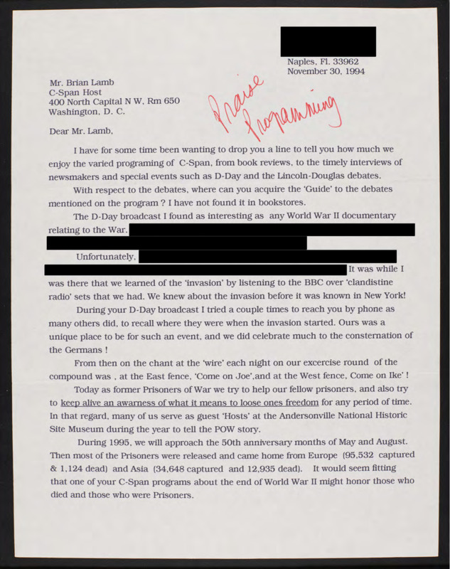 Letter to C-SPAN, 1994-11-30; 33962