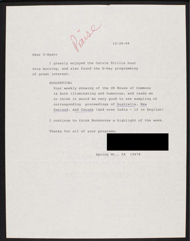 Letter to C-SPAN, 1994-12-26; 19478
