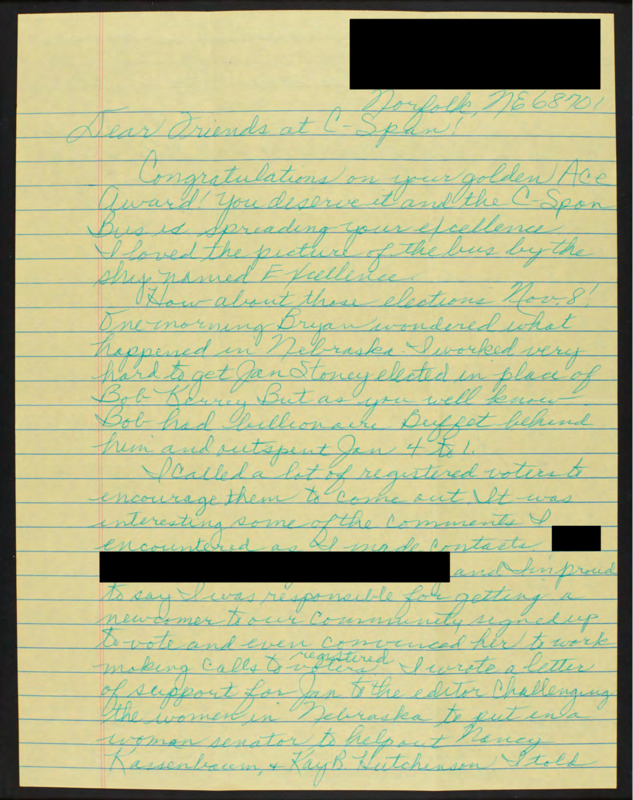 Congratulates the network on receiving an award and praises the C-SPAN Bus. Expresses support for Republicans in Congress and discusses the Nebraska elections and Governor.