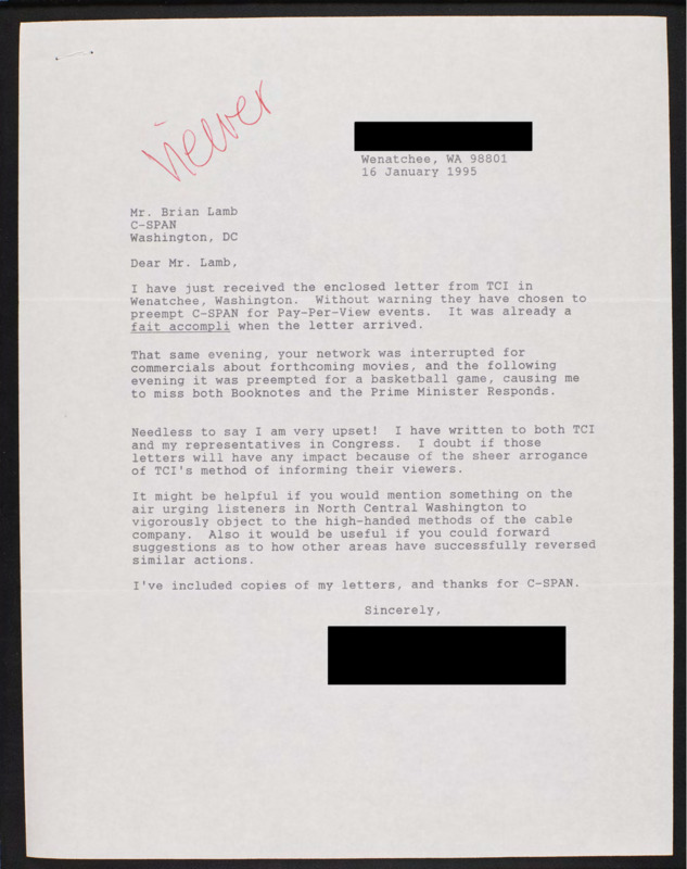 Letter to C-SPAN, 1995-01-16; 98801