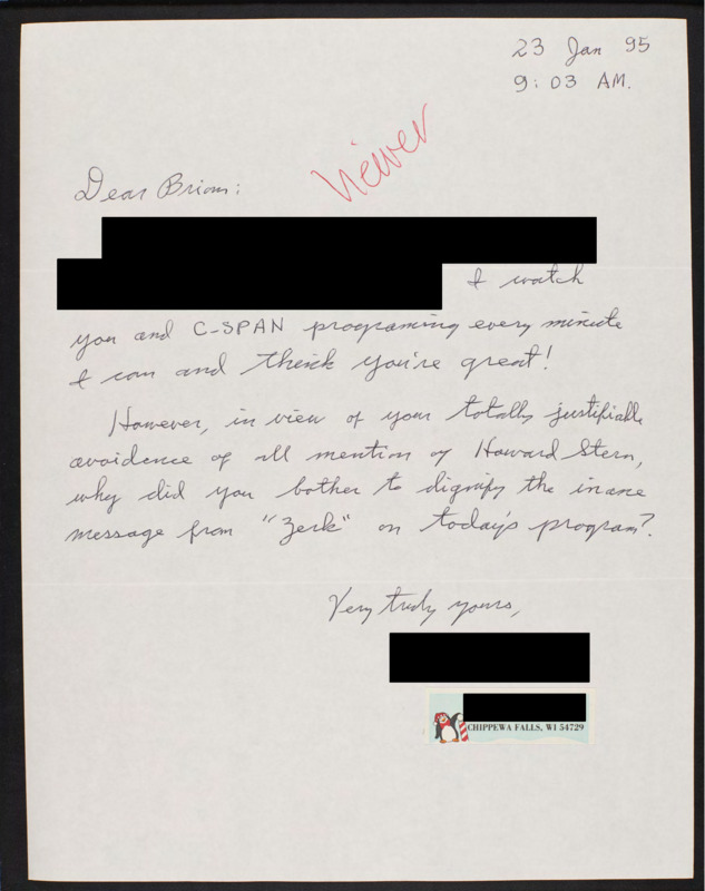 Shares how they used to be a school teacher and are currently employed in a used bookstore. Asks why the network acknowledged Howard Stern.