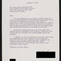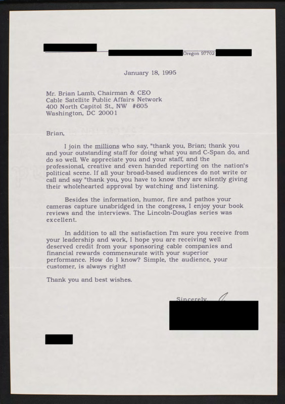 Thanks the network and Brian Lamb for being professional and creative in reporting the political scene. Describes the programs they enjoy and refers to the Lincoln-Douglas program as excellent.