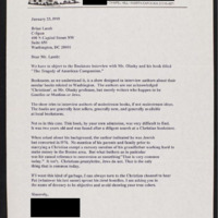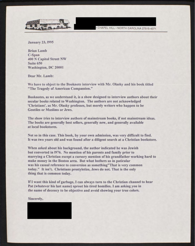 Objects to the Booknotes interview with Marvin Olasky because it did not follow the expectation of secular books about Washington D.C. and because of its discussion of religion.
