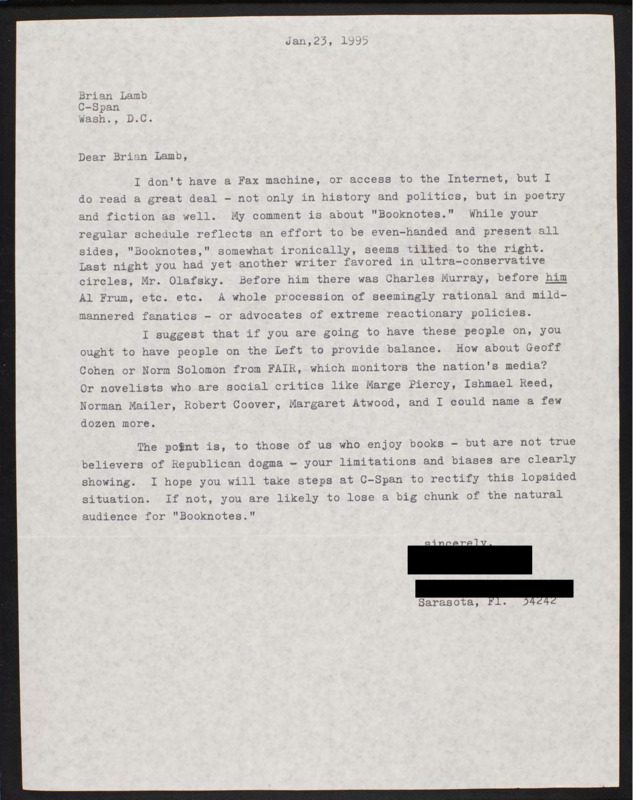 Accuses Booknotes of having a conservative bias because of its recently featured authors and suggests people from the left to invite on.