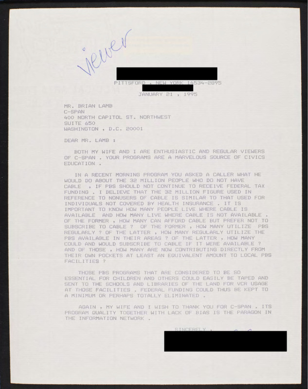 Letter to C-SPAN, 1995-01-21; 14534
