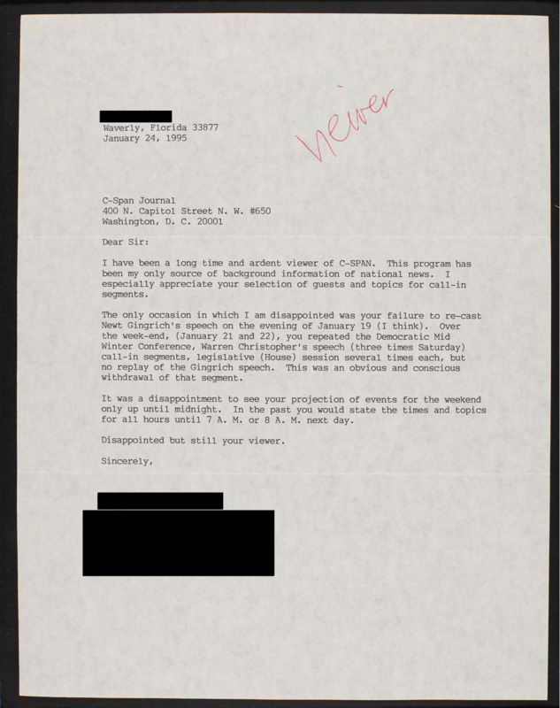 Letter to C-SPAN, 1995-01-24; 33877