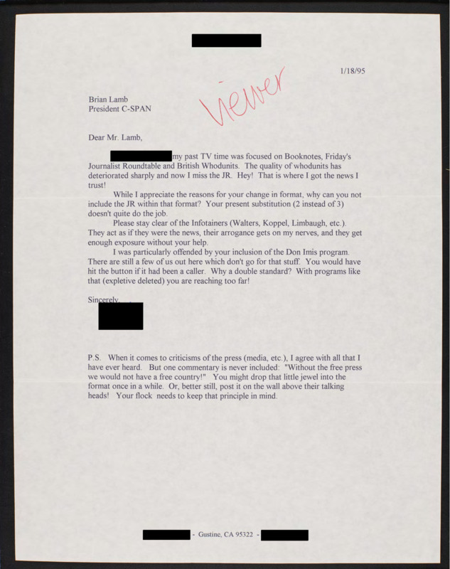Letter to C-SPAN, 1995-01-18; 95322