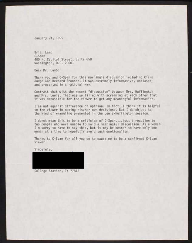 Thanks the network for the discussion with Clark Judge and Bernard Aronson. Contrasts it to a program with Mrs. Huffington and Mrs. Lewis which they felt was uncivil.