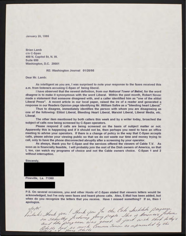 Letter to C-SPAN, 1995-01-20; 71360