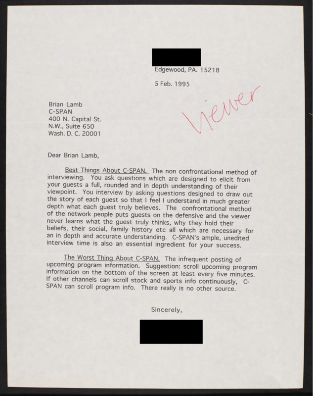 Letter to C-SPAN, 1995-02-05; 15218