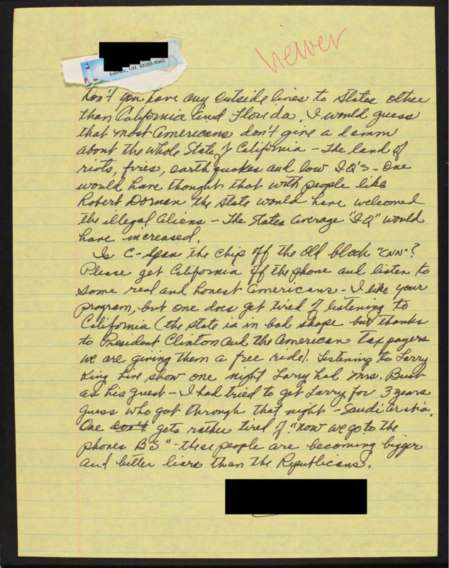 Complains about calls only coming from California and Florida, expresses a dislike towards the state of California, and recounts being unable to call-in during Larry King Live as well.