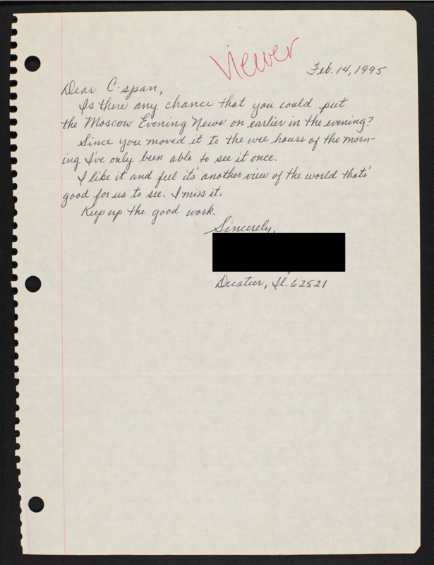 Asks if the Moscow Evening News could be televised earlier in the evening.