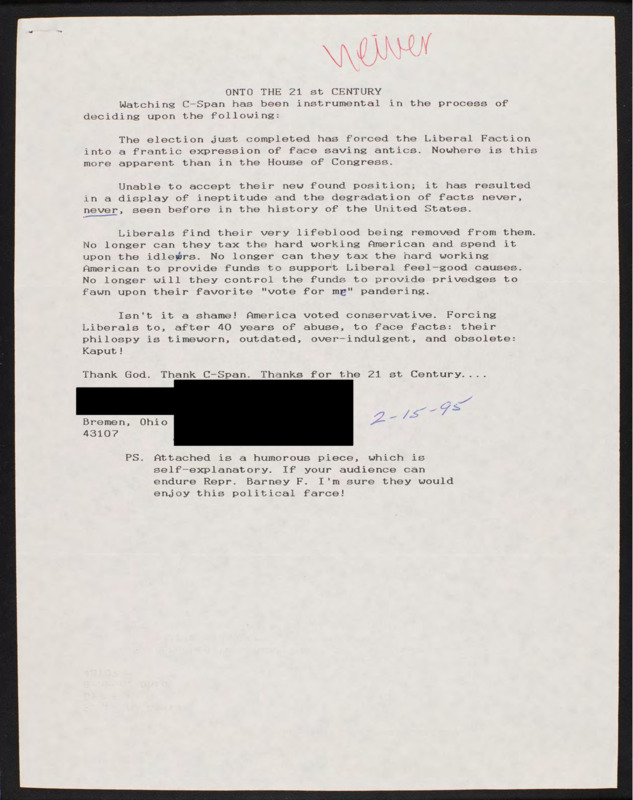 Letter to C-SPAN, 1995-02-15; 43107
