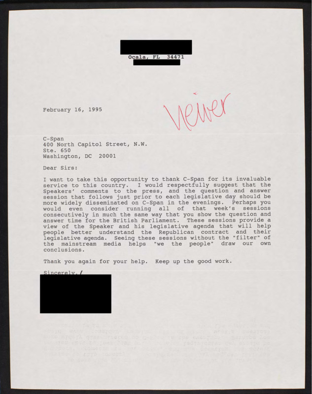 Suggests airing the Speaker's question and answers consecutively in the evenings as they believe it will help people understand the Republican contract and the legislative agenda.