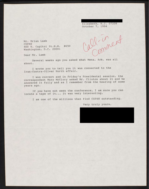 States Mena, Arkansas was connected to the Iran-Contra-Oliver North affair. Says it was confirmed by Bill Clinton with correspondent Mary McClory at a conference and recommends Brian Lamb view the conference.