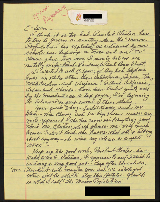Calls the general population of the United States "morons," asks if C-SPAN has phone lines in multiple states because they may be overrepresented, criticizes Linda Chavez, and defends Bill Clinton.
