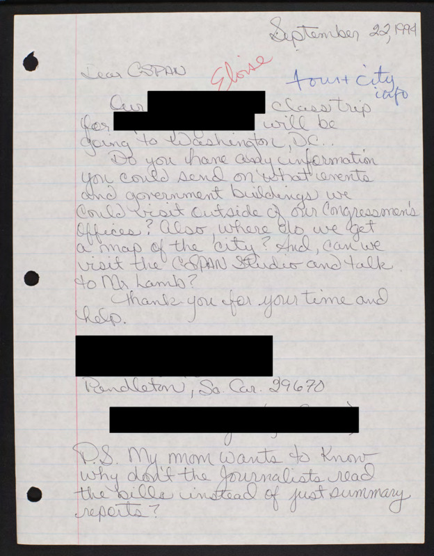 Asks if their are any buildings or attractions to visit on their eight-grade class trip to Washington D.C. Their mom asks why journalists read summary reports and not the bills.