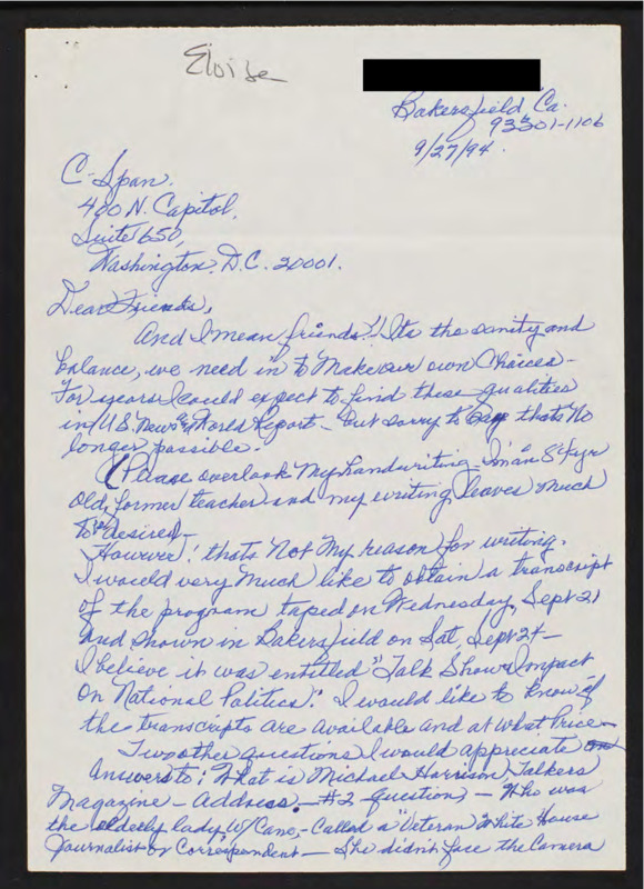 Letter to C-SPAN, 1994-09-27; 93301